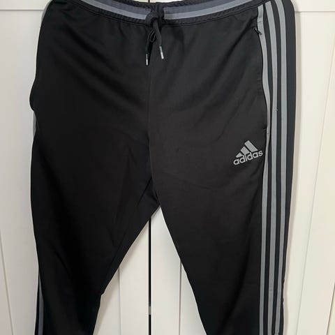 Adidas miesten treenihousut salitreeniin. Koko M. Väri musta, lahkeissa valkoiset raidat. Joustava kuminauhavyötärö ja kiristysnauha. Materiaali teknistä, hengittävää kangasta (polyesteri). Sopivat erityisesti salitreeniin ja muuhun urheiluun.