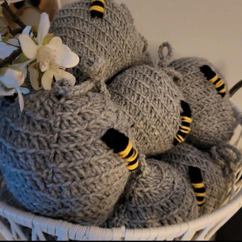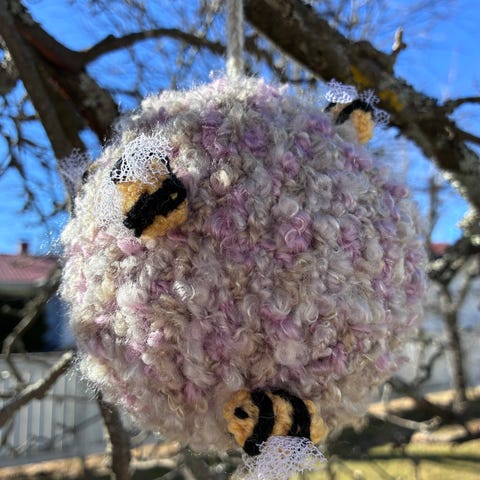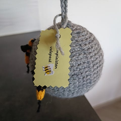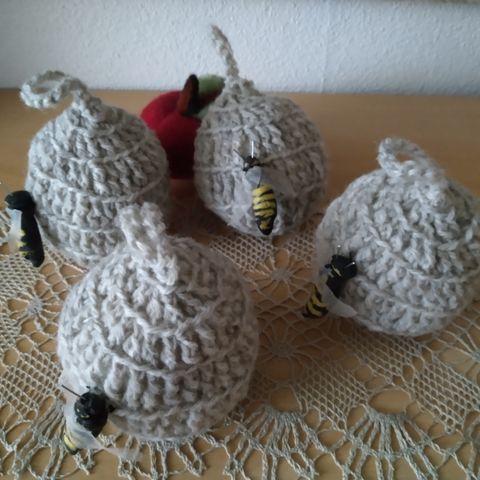 Halkaisija noin 9,5 cm, virkattuja ampiaisia pallossa ”pörrää” 3 kpl.