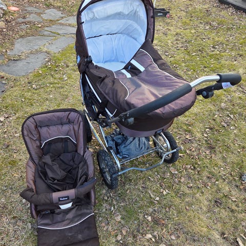 Emmaljunga yhdistelmävaunut. Pakettiin kuuluu vaunukoppa, istuinosa ja runko. Toinen rengas kulunut, pystyy kuitenkin käyttämään.