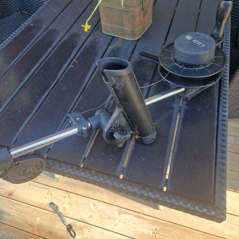2kpl scotty 1080 takiloita, pystyyn lukittavat. Tuosta mallinumerosta en ole varma. Toiseen vaihdettu pitempi puomi.
