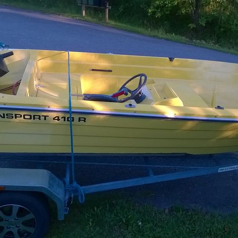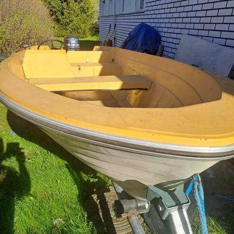 Lasikuituvene, jossa ohjauspulpetti ja istuinpenkki. Veneen sisäosa on oranssi ja ulkopuoli vaalea. Pohjassa ja kyljissä on näkyviä vaurioita ja kulumaa, jotka edellyttävät kunnostusta. Sopii kunnostettavaksi esimerkiksi mökki- tai yhteysveneeksi. Vene on perämoottorikäyttöön soveltuva; moottori ei sisälly kuviin.