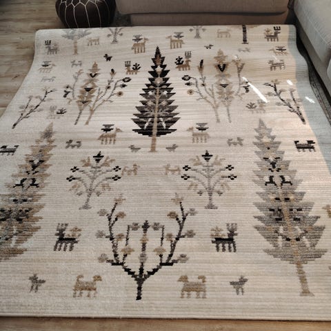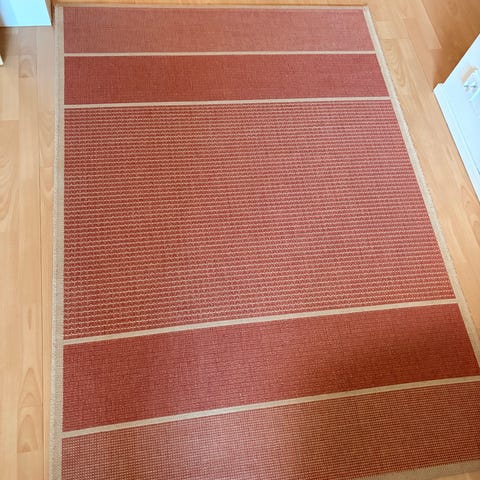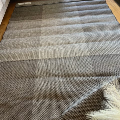 Iso matto, väriltään harmaanbeige. Matala nukka, suhteellisen helppo pitää siistinä. Imuroin maton hetki sitten hyvin, ostaja voi halutessaan vielä tampata maton. Muuten käyttövalmis.