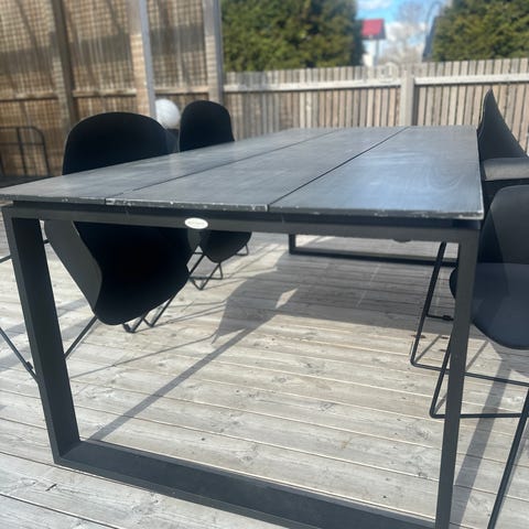 Todella hieno ja täysin uniikki pöytä joko ulos tai sisälle. Pieniä kolhuja lasin kulmassa, muuten hyvässä kunnossa ja ajan patinoimaa takkirautaa
