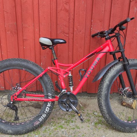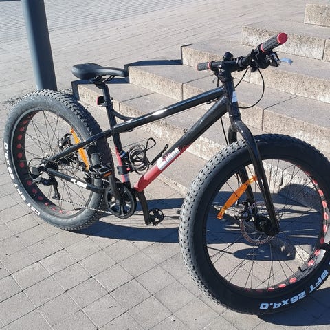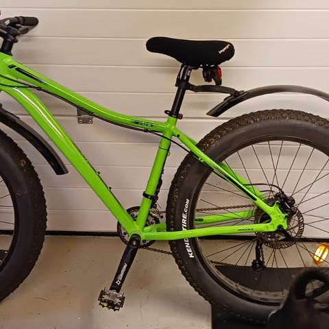 White maastopyörä 26" -renkailla, rungon koko L ja unisex-mitoitus. Vihreä alumiinirunko, jossa merkintä 19" ja FAT x W All Terrain Frame. Pyörässä on leveät, nappulakuvioidut renkaat vaihteleviin ajo-olosuhteisiin. Jarruina on mekaaniset levyjarrut (Tektro), ja vaihteistossa Shimano Acera -vaihtaja. Sopii maastoajoon ja yleiseen pyöräilyyn aikuisille käyttäjille, joille L-kokoinen runko on sopiva (max 185 cm). Kevytlokasuojat. Siistissä kunnossa, vaikka käytön jälkiäkin toki on.