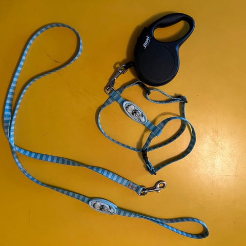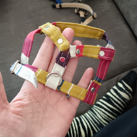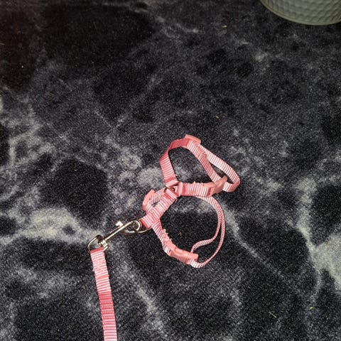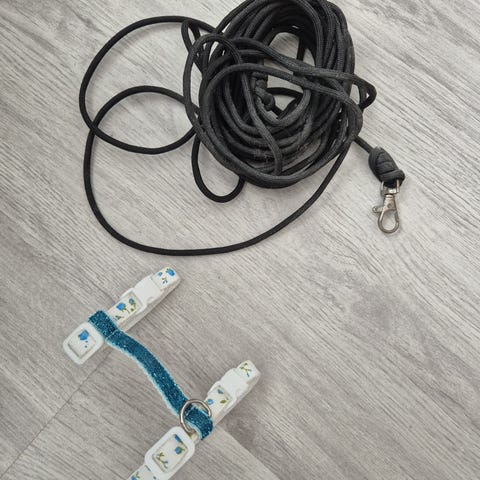Uudet käyttämättömät kanin valjaat talutushihnalla.