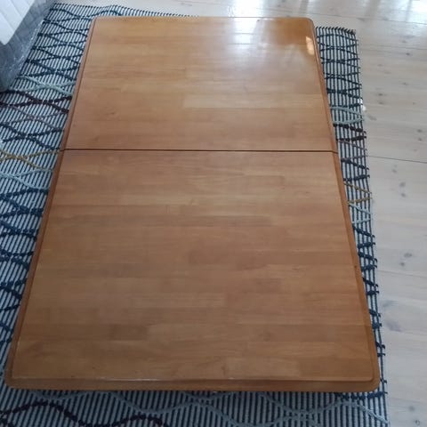 Puinen jatkettava ruokapöytä, jossa ruskea pöytätaso ja maalattu runko. Pöydässä on jatkolevyt, joiden avulla pöydän pinta-alaa saa suurennettua useammalle istujalle sopivaksi. Sopii ruokailu- tai keittiöpöydäksi. Pöydän pinnassa on käytön jälkiä ja kulumaa, jotka näkyvät kuvissa.