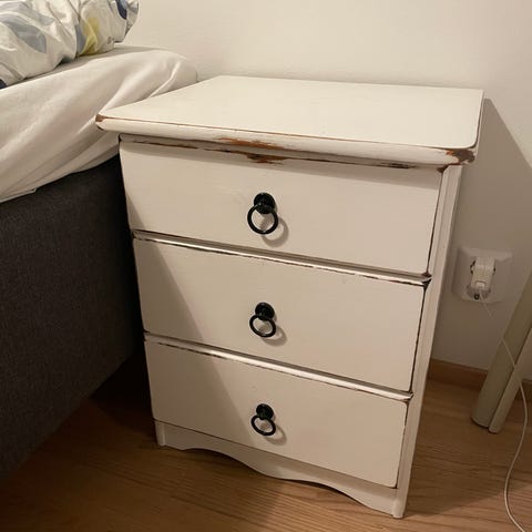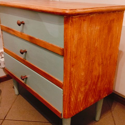 Pieni ruskeapuinen lipasto, hieman ajan patinaa näkyy. Voi olla hyvä myös yöpöytänä.
