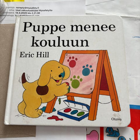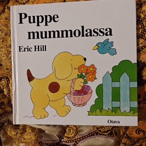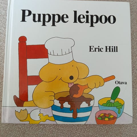 Eric Hillin "Puppe oppii värejä, muotoja ja numeroita",kirjassa seurataan Pupen ja hänen ystäviensä puuhia ja opetellaan samalla värejä, muotoja ja numeroita yhdestä kymmeneen. Sivut sisältävät värikkäitä kuvia ja nimettyjä esineitä, jotka tukevat sanavaraston ja peruskäsitteiden oppimista pienille lapsille yhteisen lukuhetken aikana.