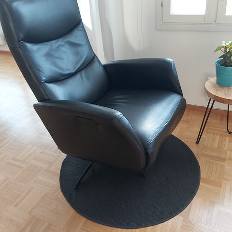 Konjakinruskea, kaunis lepakkotuoli tukevalla rautarungolla ja istuin paksua nahkaa. Järjestys vaihtui eikä löydä enää paikkaa niin myyn pois.