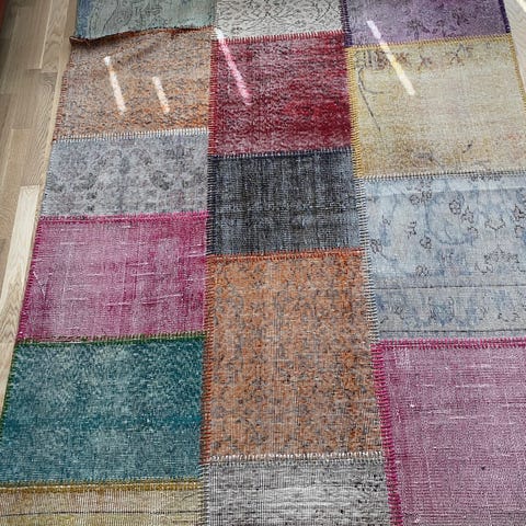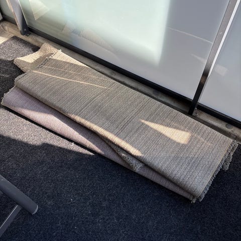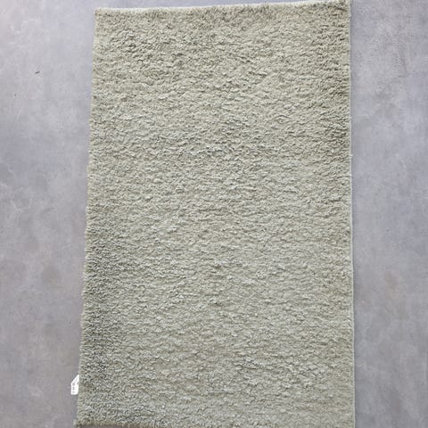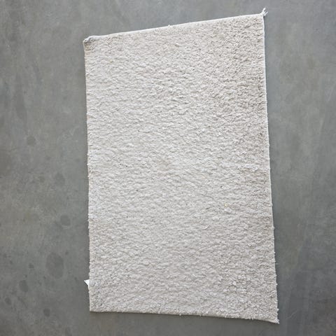 Valkoinen pitkänukkainen matto. Kaipaa pesua, kissakoti.