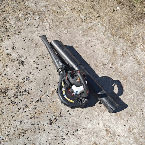 Puhaltimen putki kateissa, korvattu tyylikkään ajattomalla 75mm viemäriputkella ja ilmastointiteipillä. Peukalolla toimiva kaasun "lukitus" ei toimi. Liipaisimesta vaijeri liikkuu normaalisti.