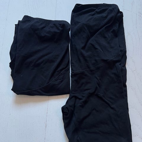 Superihanat Lindexin MOM mustat venyvät äitiyslegginsit/urheilulegginsit, koko M, mutta menee myös pienemmälle. Itse olen kokoa S, en tykkää liian kiireistä housuista.