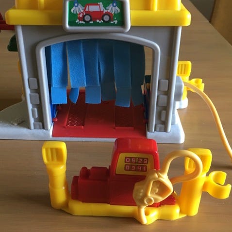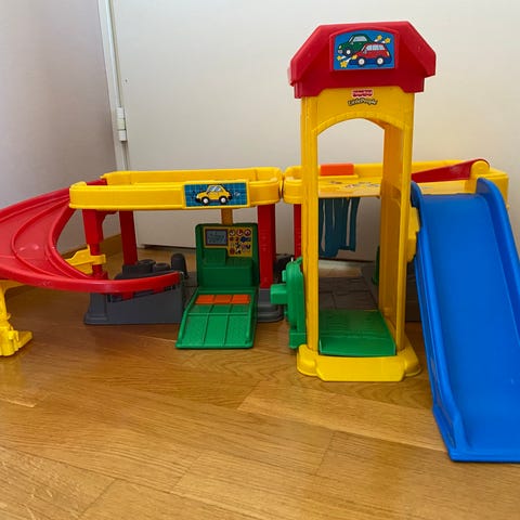 Fisher-Price parkkitalo, jossa useampi taso, ramppi ja keltainen spiraaliliukumäki autoille. Sivussa käsikäyttöinen hissi, jolla autot voi nostaa ylemmille tasoille. Hyvä kunto. Eläimetön koti.