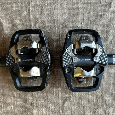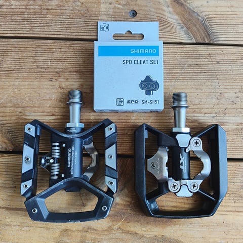 Hyväkuntoiset Shimano PD-M530 lukkopolkimet. Kaksipuoleinen lukitus.