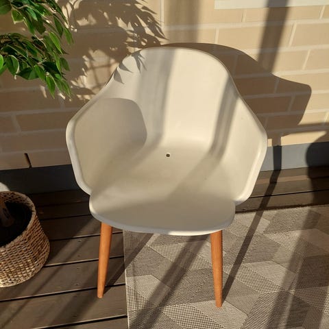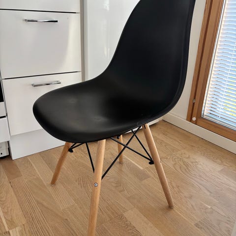 6 kpl puisia tuoleja beigellä istuinpehmusteella. Istuinpehmusteet kuluneet, osassa tuoleissa kissa järsinyt pehmusteen kulman rikki ( ks. kuva). Näppärä tekijä vaihtaa kankaan. Tuolien selkänojan reunoissa myös kulumaa( ks. kuva). Istumakorkeus n. 45cm, selkänojan korkeus lattiasta n. 103 cm.