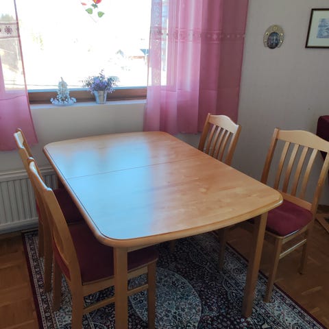 Keittiönpöytä (punapyökki) + 6 kpl tuoleja, pöytä hyvässä kunnossa, tuoleissa kulumisen jälkiä