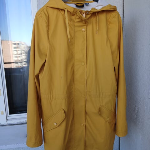 Pitkä sadetakki naisille. Koko 36-38. Väri on kellertävä. Takissa on vyö ja etutaskut sekä hihansuissa solkikiristykset. Toisessa taskussa pientä värjäymää. Muuten hyvä, ehjä ja alkuperäinen!