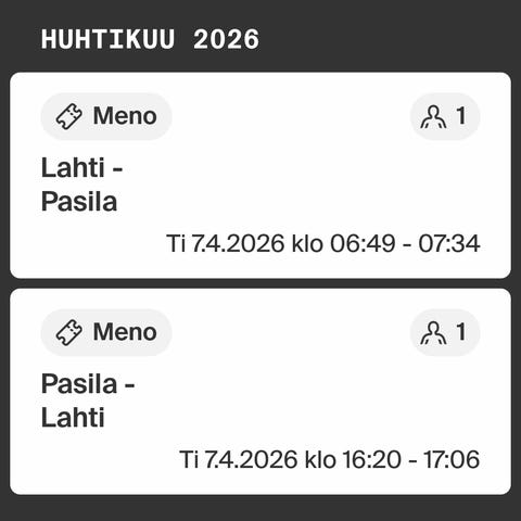 1x Opiskelijan VR junalippu Lappeenranta–Pasila ja Pasila-Lpr 14.4.