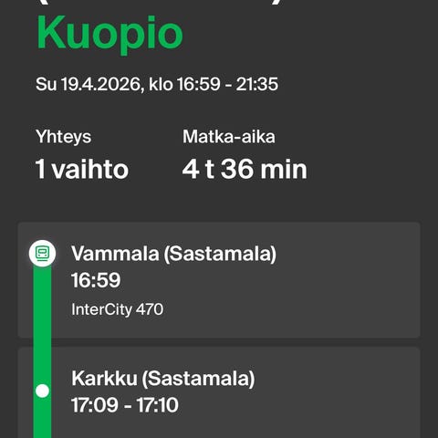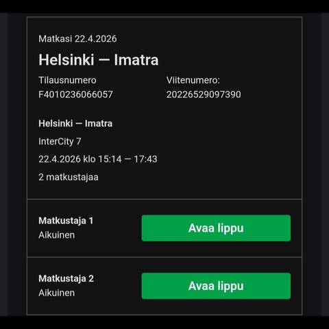 VR opiskelijan junalippu (vaatii siis opiskelijakortin) reitille Pasila-Lappeenranta (7.00-9.04) ja Lappeenranta-Pasila (17.41-19.38) päivämäärällä 14.4.2026. Lippu on sähköinen ja se näytetään digitaalisessa muodossa. Sopii matkustamiseen kyseisellä aikavälillä, mainittuna päivänä annetulla reitillä VR:n junassa.
