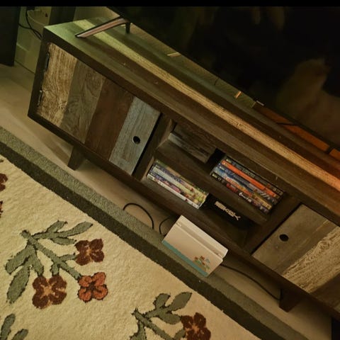Tv-taso, jossa puukuvioidut ovet ja musta runko. Tammiviilu kuvioidut ovet, joiden takana on säilytystilaa. Takapuolella on aukkoja johtojen läpivientiä varten. Sopii televisiolle ja mediavälineiden säilytykseen olohuoneessa.