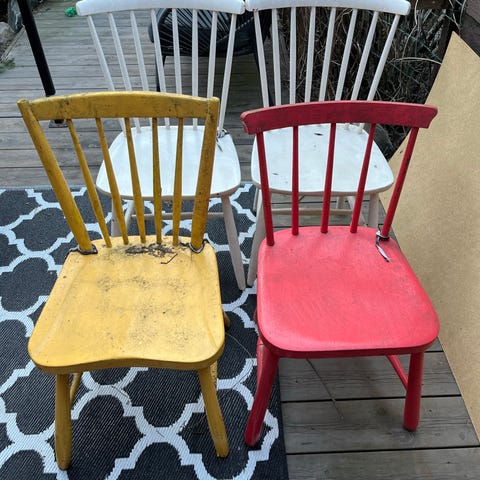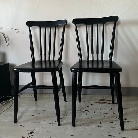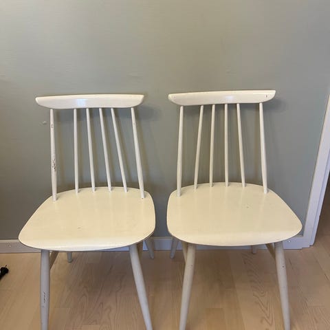 2 kpl valkoiset pinnatuolit, istuinosa puuta, kulumaa on, pinnat vaatii liimausta/kiristystä. Myydään yhdessä yht. 50 e.