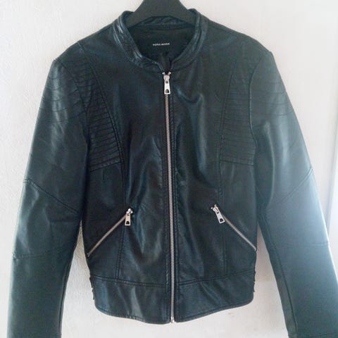 ONLY naisten tekonahkatakki, koko L. Musta väri, edessä vetoketjukiinnitys. Takissa on kaksi vetoketjullista taskua edessä. Hihoissa myös vetoketjut. Pyöreä pääntie ja kevyesti muotoiltu leikkaus, levenee helmasta.