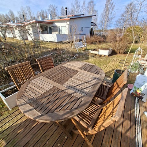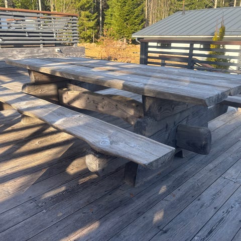 Puutarhapöytä penkeillä harmaa puu. Massiivisesta puusta valmistettu ulkokalustekokonaisuus, johon kuuluu pöytä ja kiinteät penkit molemmilla puolilla. Sopii pihalle, terassille tai muuhun ulkotilaan ruokailu- ja oleskelukäyttöön. Harmaa käsittely antaa kalusteelle yhtenäisen ilmeen ja suojaa puupintaa. Rakenne on tukeva ja suunniteltu useamman henkilön istumiseen.