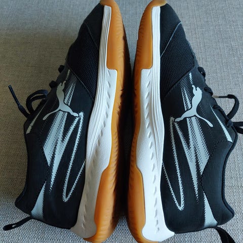 Puma sisäpelikengät, koko EUR 39 (UK 6, CM 25). Väriltään valkoiset mustilla yksityiskohdilla ja kumipohjalla. Nauhakiinnitys.