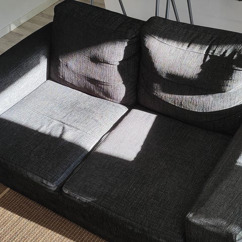 Sohvassa ei siis muuta vikaa, kuin haalistunut väri. Sisälle en ehkä enää ottaisi, mutta parvekkeella tuo kivasti istumapaikkoja.