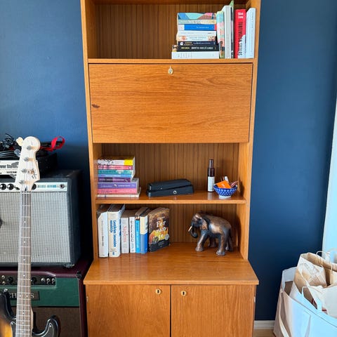 Mid-century skandinaavinen tiikkihylly liukuovilla