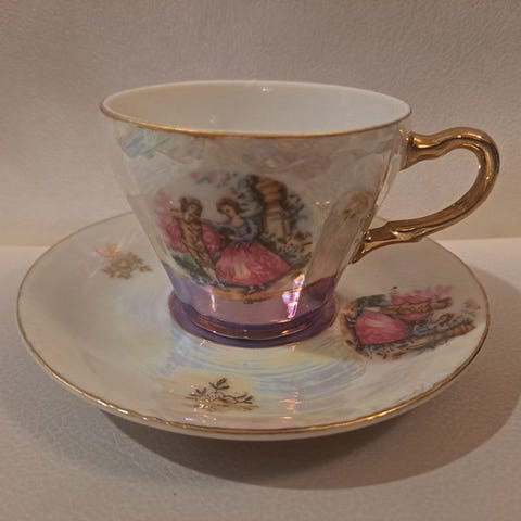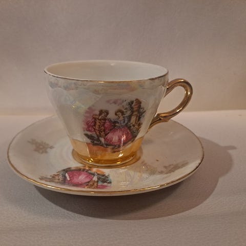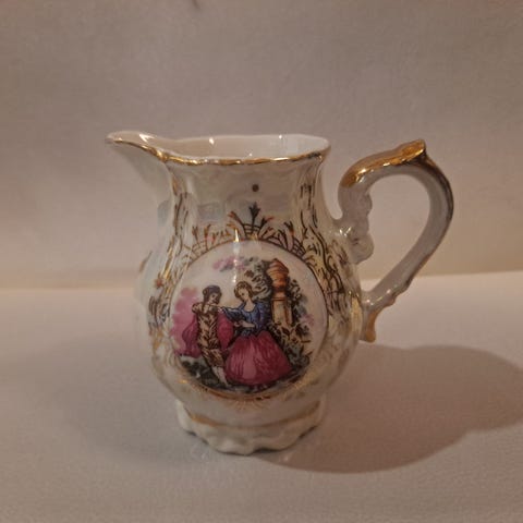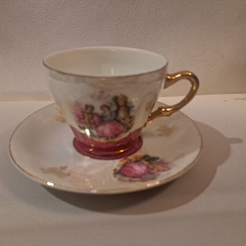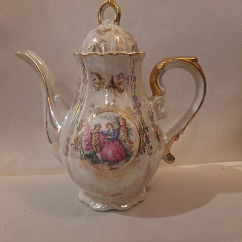 Posliininen kahviastiasto, jossa romanttiset koristekuviot ja kultaukset. Settiin kuuluu kahvikannu, kermakko, sokerikko sekä useita kahvikuppeja ja aluslautasia. Kupit ja kannu ovat valkoista posliinia, joissa on monivärinen kuva-aihe ja kullanväriset reunat sekä kahvat. Soveltuu kahvin tai teen tarjoiluun ja kattaukseen.