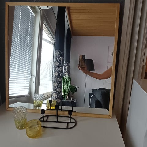 Myydään hyväkuntoinen peili puukehyksellä. Sopii esimerkiksi eteiseen, makuuhuoneeseen tai muuhun sisätilaan seinälle ripustettavaksi tai lattialle nojaavaksi peiliksi. Puukehys tuo luonnollisen ilmeen sisustukseen. Hp. 15 euroa.