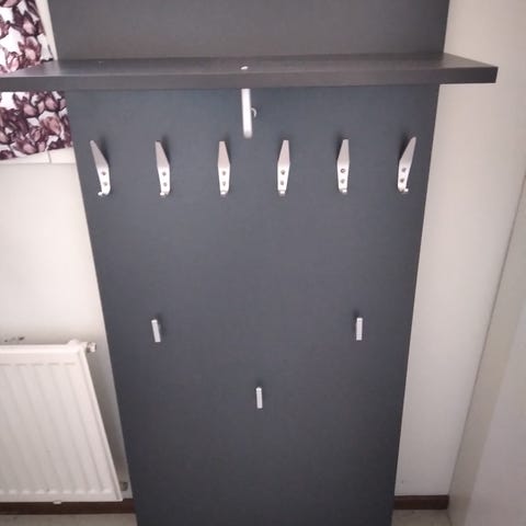 Etuosassa penkki, takana kenkähyllyt, keskellä naulakkokoukut (2kpl / väli) ja ylhäällä saranoidut kaapit, ylimmäisenä vielä hyllyt. Kaapeissa ei taustaa, seinä toimii taustana.