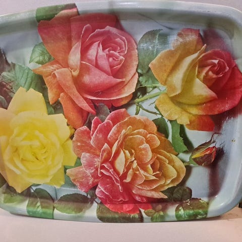 Pyöreä peltirasia, jossa kannessa ja reunoilla monivärinen ruusukuviointi vaaleanpunaisella taustalla. Rasia on valmistettu metallista ja siinä on irrotettava kansi. Sopii esimerkiksi pienten tavaroiden, ompelutarvikkeiden tai kuivien elintarvikkeiden säilytykseen sekä koristekäyttöön.