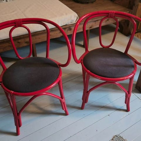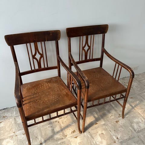 Kaksi käsinojallista tuolia.Pehmusteet uusittu.Maalipinta kohtalainen/maalattavissa kun hio vanhat pois jos haluaa muuten ehjät. Hinta sen takia vain 80 euroa yht.