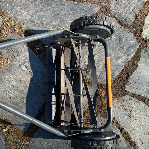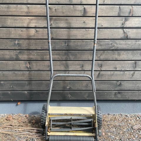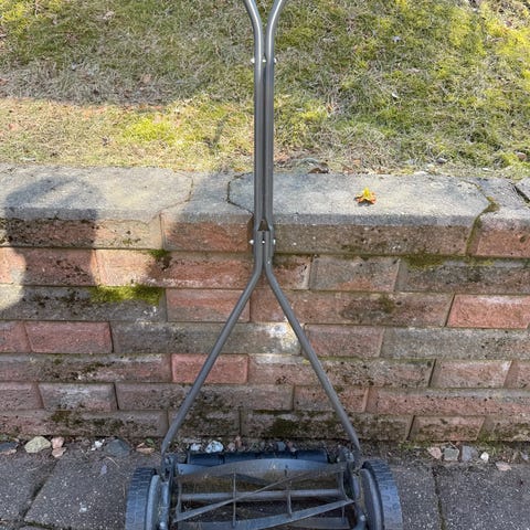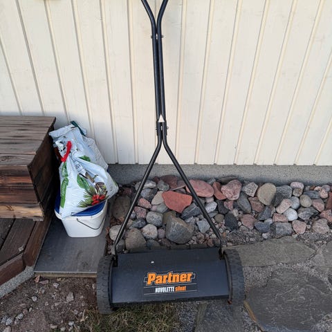 käsikäyttöinen ruohonleikkuri. Mallissa on työntöaisa ja kaksi pyörää, joiden välissä on leikkuusylinteri. Leikkuri soveltuu nurmikon leikkaamiseen ilman sähköä tai polttoainetta, ja se on tarkoitettu käytettäväksi kotipihoilla ja puutarhoissa.
