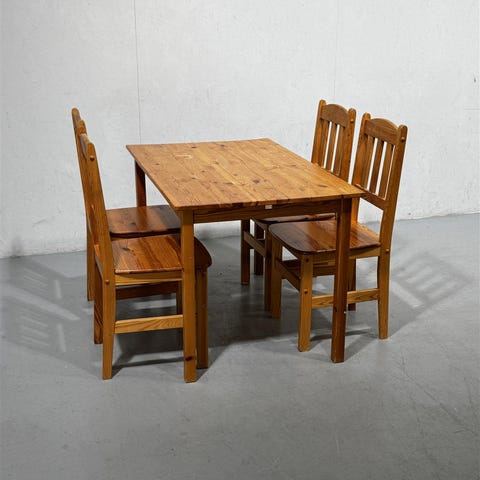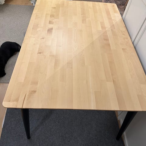 Puunvärinen 6-hengen ruokapöytä, U-mallisilla mustilla metallijaloilla. Muistaakseni Maskusta tai Askosta ostettu ovh n600€. Käytönjälkiä on muutama naarmu ja kulmasta lohjennut pieni pala. Pala on tallella, luultavasti pikaliimalla saa korjattua. Tällä hetkellä pöytä häkkivarastossa, jalat irrotettuina. Vain nouto