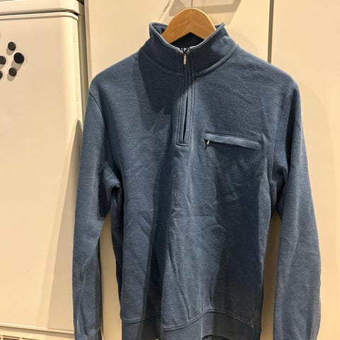 Dressmann miesten puuvillatakki koossa S. Väri tummansininen. Takissa on vetoketjukiinnitys ja korkea kaulus, jossa raidalliset yksityiskohdat. Edessä on taskut. Materiaali on puuvillaa, joka tekee takista pehmeän ja mukavan arkeen tai vapaa-aikaan.