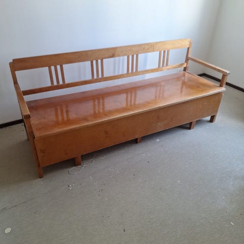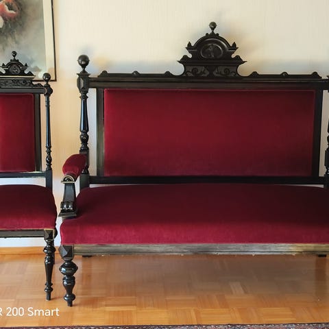 Nappikoristeinen puusohvaryhmä, johon kuuluu kolmipaikkainen sohva sekä kaksi nojatuolia. Runko on kaiverrettua puuta ja verhoilu ruskeaa kangasta, selkänojassa on napitettu pintakuviointi. Sohvassa ja tuoleissa on pehmustetut istuimet ja käsinojat. Sopii olohuoneeseen tai edustustilaan istuinryhmäksi.