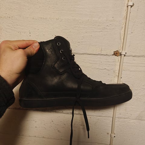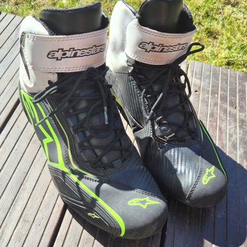 Alpinestars tennarit koko 44. Väritys musta ja neonkeltainen, valkoisilla yksityiskohdilla. Korkea varsi ja nauhakiinnitys. Ainoastaan pari kertaa käytetty.