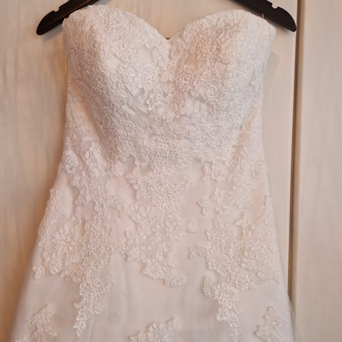 Shampanjan vaalea, tyylikäs pitsinen hääpuku, jossa tylliä ja laahus. Hameosaan tarvitaan vannealushame (ei kuulu hintaan) Yläosaan kuuluu bolero. Ostettu liikkeestä ja oli kallis. Pituuteni 178 cm ja oli hyvä helman pituus. Tule rohkeasti sovittamaan. Puku pesetetty häiden jälkeen.