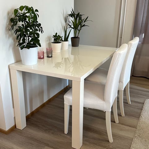 Myydään valkoinen ruokapöytä, jossa on kaksi jatkopalaa. Jatkopaloja voi käyttää joko yhtä tai molempia. Pöytä on tällä hetkellä varastoituna jalat irrottettuina, joka helpottaa kuljetusta. Mitat: 140cm pitkä ja 84cm leveä + jatkopalat 40cm + 40cm (2kpl). Pöydässä jotain pieniä virheitä, pinnassa jotain naarmuja, mutta yleisilmeeltään edelleen siisti!