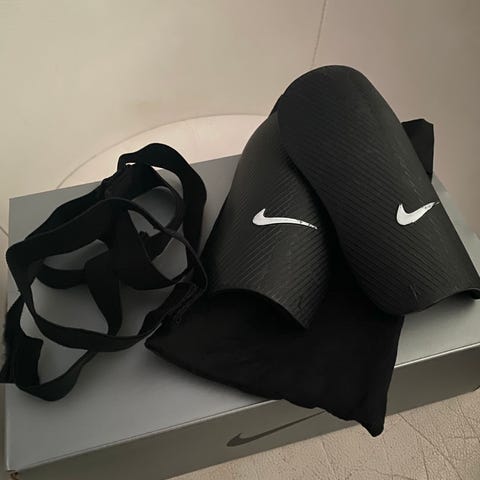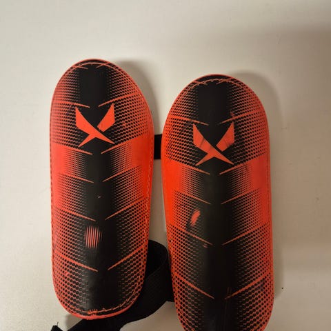 Hyvässä kunnossa olevat suojat ja sukat. Yhdessä sukassa reunassa 2 pientä reikää, jotka mahdollista paikata. Koko 140cm-160cm
