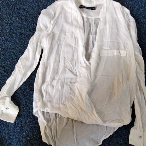 Zara paita naisille, koko S. Väriltään valkoinen ja materiaaliltaan viskoosia. Pitkähihainen malli, jossa kaulus ja nappikiinnitys edessä. Edessä kaksi rintataskua. Sopii arki- ja toimistokäyttöön sekä yhdisteltäväksi erilaisten alaosien kanssa.