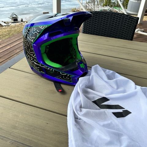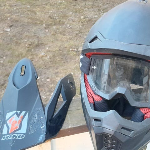 Crossipyörän kypärä laseilla.Pieni halkeama joka liimattu muuten ehjä.Kuva siitä on.