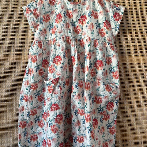 Handmade pioni mekko trikoosta. Käytetty koossa 134/140. Ei ole oma tekeleeni, vaan ostettu. Yleisilmeeltään siisti, mutta pieniä moitteita löytyy. Toisessa hihassa pieni reikä, ei ole läpi sauman alapuolisesta kankaasta. Selkäpuolelta parsittu pieni reikä siististi. Helmasaumassa sauman ommel paikoin purkautunut, ei ole kuitenkaan lähtenyt purkautumaan lisää. Yhä ehdottomasti käyttökuntoinen arjessa!
