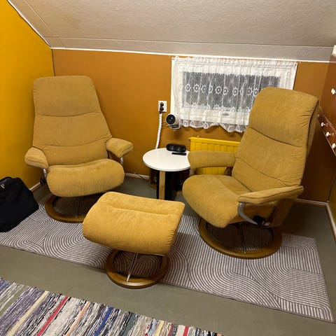 Tyylikästä ja ajatonta norjalaista muotoilua, Ekornes Stressless Orion nojatuoli ja rahi. Musta nahkaverhoilu erinomaisessa kunnossa. Sekä tuolin että rahin kaikki mekanismit toimivat: tuoli ja rahi pyörivät, molempien asentoa voi säätää, myös päätien korkeus säädettävissä. Nojatuolin mitat noin 98x72x88cm (korkeus x leveys x syvyys). Rahi 40x55x39cm.