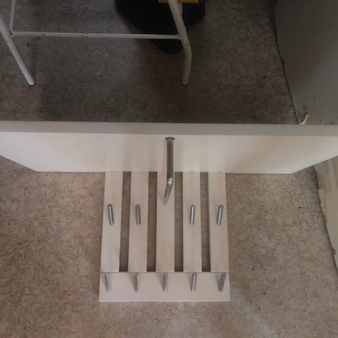 Puretusta keittiöstä ylimääräiseksi jäänyt kaappi ja naulakko/hylly.