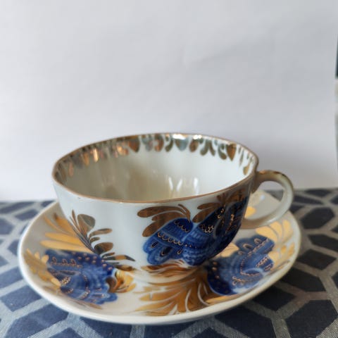 Käsinmaalattu posliiniteekuppi aluslautasella, kuppien vetoisuus 2dl.