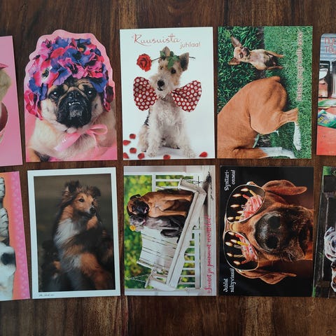 Kolmiulotteiset kortit, toisessa erirotuisia koiria ja toinen futisaiheinen pallon pomputtelu 1 euro/kortti